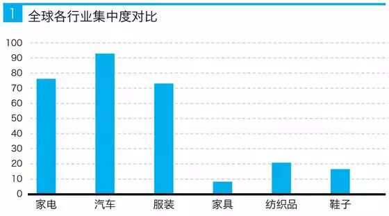 家具行业的首要特点是集中度低,这是由消费者诉求的多元化和完全竞争的市场特点决定的。图1为全球范围内各种行业的集中度对比。从中可以看出,家具行业的集中度不仅远低于汽车和家电,甚至还低于服装、纺织品和鞋类而处于最低水平。