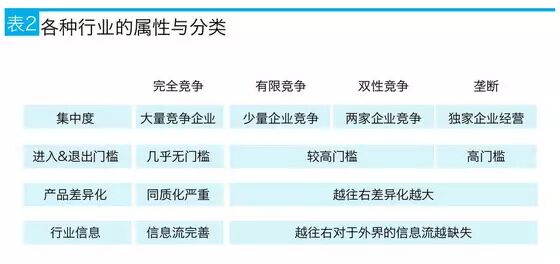 对于完全竞争行业而言,不仅竞争企业众多,而且进入与退出的门槛低、产品同质化现象严重,还有产业链信息完善,企业很难长时间持有不被别人模仿的核心技术,所以是典型的进入容易做好难的行业。表2是各种行业的属性与分类。